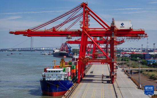 9月25日,货轮在南京港龙潭港区集装箱码头靠泊(无人机照片)。