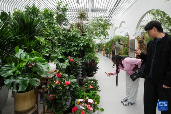 10月13日,一名外国游客在位于北京市丰台区的北京花卉交易中心参观选购花卉。