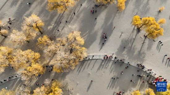 10月13日,游客在内蒙古阿拉善盟额济纳旗额济纳胡杨林旅游区游玩(无人机照片)。