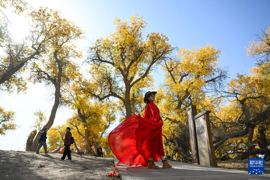 10月13日,游客在内蒙古阿拉善盟额济纳旗额济纳胡杨林旅游区游玩。