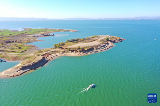 11月29日,在淅川县丹江口水库宋岗码头附近,库区综合执法大队工作人员开船巡护(无人机照片)。