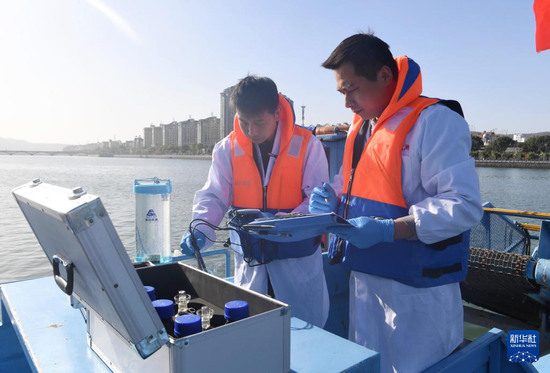 11月28日,在淅川县鹳河流域城区段,南阳市生态环境局淅川分局工作人员记录采样水质情况。