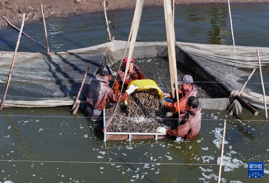 12月1日,河北省唐山市丰南区西葛镇越支五村的农民在鱼塘捕捞泥鳅(无人机照片)。