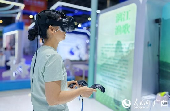 游客使用人工智能设备沉浸式体验桂林山水。人民网 付华周摄