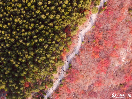 济南蝎子山山脊上的蜿蜒绿道,将秋意一分为二,勾勒出“半山翠绿半山红”的别样景致。人民网 乔姝摄
