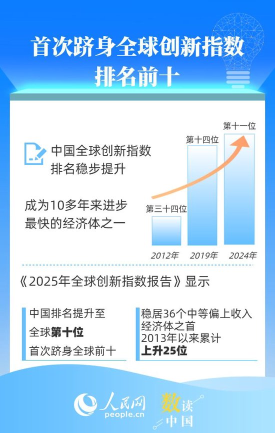 世界知识产权组织(WIPO)发布的《2025年全球创新指数报告》显示,中国排名提升至全球第10位,首次跻身全球前十;国家统计局日前发布2024年中国创新指数测算结果,2024年中国创新指数达到174.2,保持稳步增长态势。中国跑出创新“加速度”,一组数据来看。