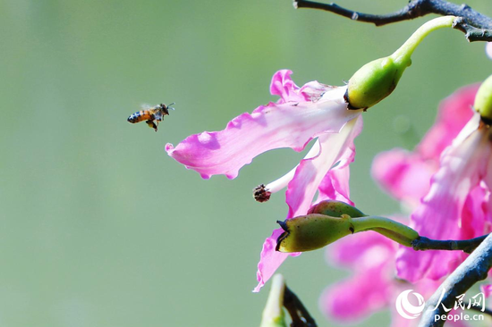 蜜蜂围绕花瓣飞舞。人民网记者 李唯一摄