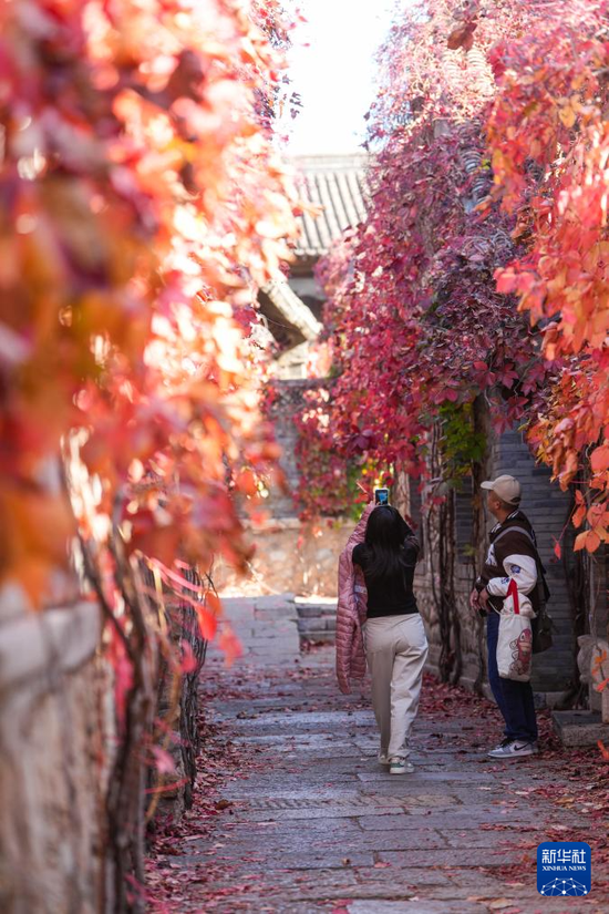 10月20日,游客在古北水镇拍摄红叶。