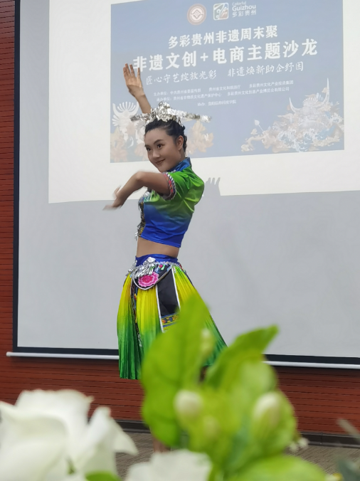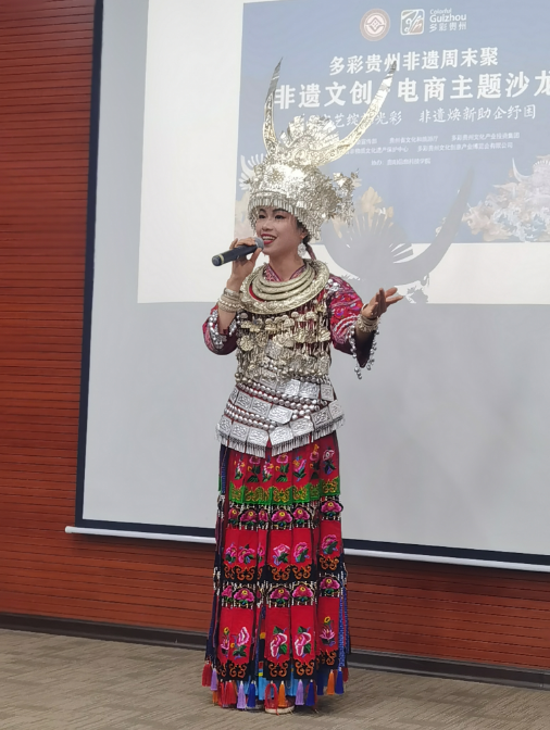 随后,贵阳信息科技学院双创中心主任夏梦、就非遗文创与电商结合相关内容进行主讲发言。贵州省施秉县舞水云台旅游商品开发有限公司总经理龙宇、贵州山呷呷信息技术(集团)有限公司执行董事阳章伟等企业代表围绕非遗文创与企业需求进行交流发言,并与现场的非遗爱好者、创业者们互动交流。