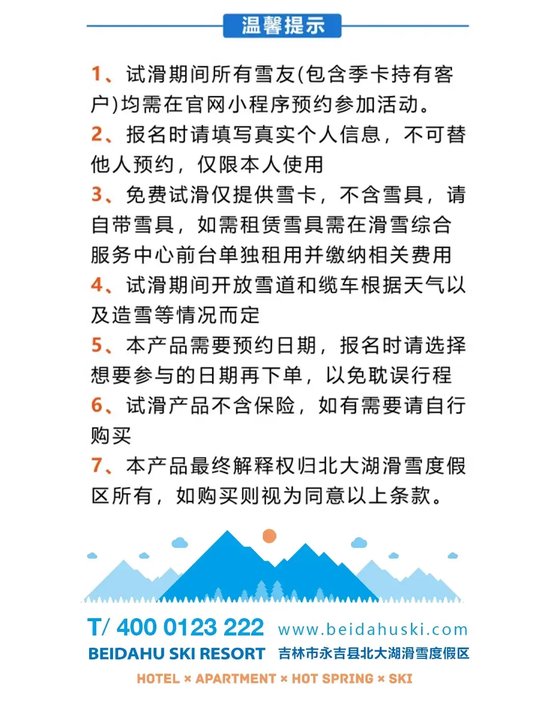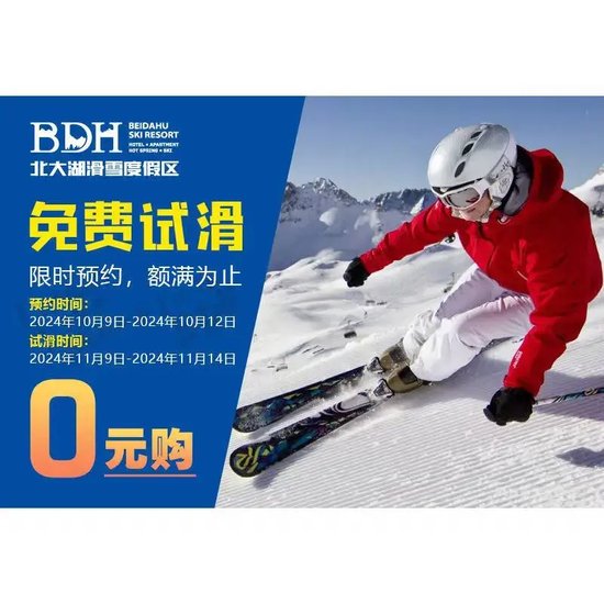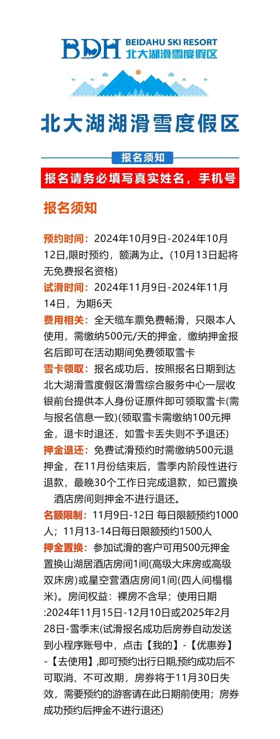 试滑活动免费报名,需缴纳500元押金。预约成功后,按照预约日期到达北大湖滑雪度假区滑雪综合服务中心一层收银前台出示本人身份证即可领取雪卡,免费滑雪。*24/25雪季季卡用户、青少年精英卡、多年卡、非业主本人业主卡等季卡,也需要参加预约才能在试滑期间滑行。北大湖新雪季将于11月16日正式开始,您的季卡届时生效。