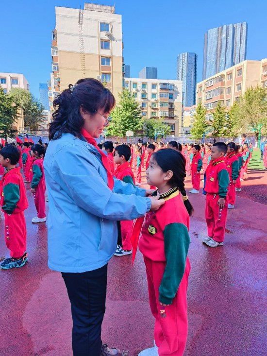 星星火炬闪耀着光芒,指引我们前进的方向。在宣读新队员名单后,各中队辅导员为新队员们佩戴了鲜艳红领巾。红领巾在胸前轻轻飘动,宛如一抹鲜红的火焰,照亮了新队员们的梦想与航向。